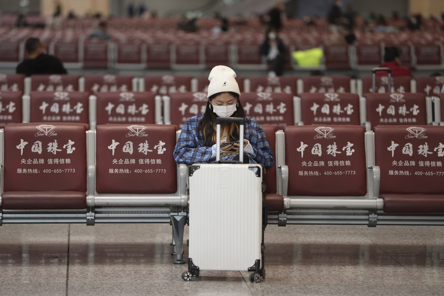 A traveler wearing a face mask is seen at Harbin Railway Station in Harbin, northeast China's Heilongjiang Province, Oct. 2, 2021.(Xinhua/Zhang Tao)