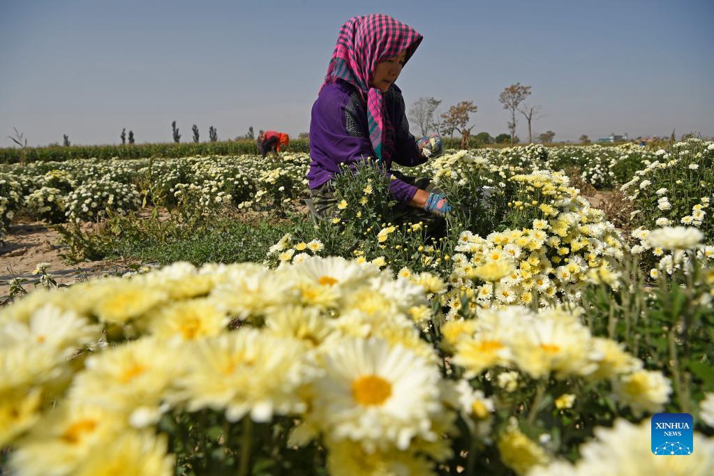 A farmer picks chrysanthemums in Lingsha Township of Pingluo County, Shizuishan, northwest China's Ningxia Hui Autonomous Region, Sept. 30, 2021. Farmers are busy in harvesting chrysanthemums recently in Lingsha Township. Local authorities have introduced traditional Chinese medicine manufacturers to promote the development of chrysanthemums industry with integration of planting, processing and sales. (Xinhua/Wang Peng)