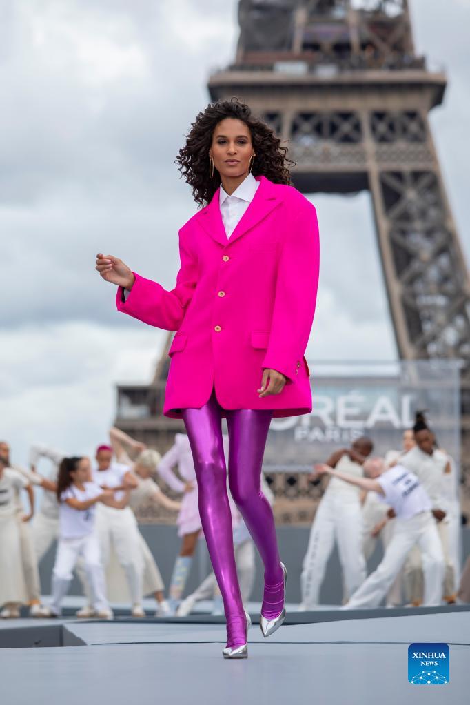 A model presents a creation for L'Oreal on the sidelines of the Paris Fashion Week Spring-Summer 2022 Ready-to-Wear collection shows at the Trocadero in Paris, France, on Oct. 3, 2021. (Xinhua)