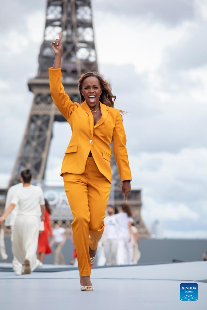 A model presents a creation for L'Oreal on the sidelines of the Paris Fashion Week Spring-Summer 2022 Ready-to-Wear collection shows at the Trocadero in Paris, France, on Oct. 3, 2021. (Xinhua)