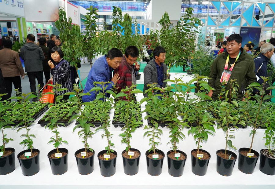 Visitors look at the plants cultivated by a tree sapling cultivation company at the 26th China Yangling Agricultural Hi-tech Fair in Yangling, northwest China's Shaanxi Province, on Oct. 22, 2019. (Xinhua/Shao Rui)