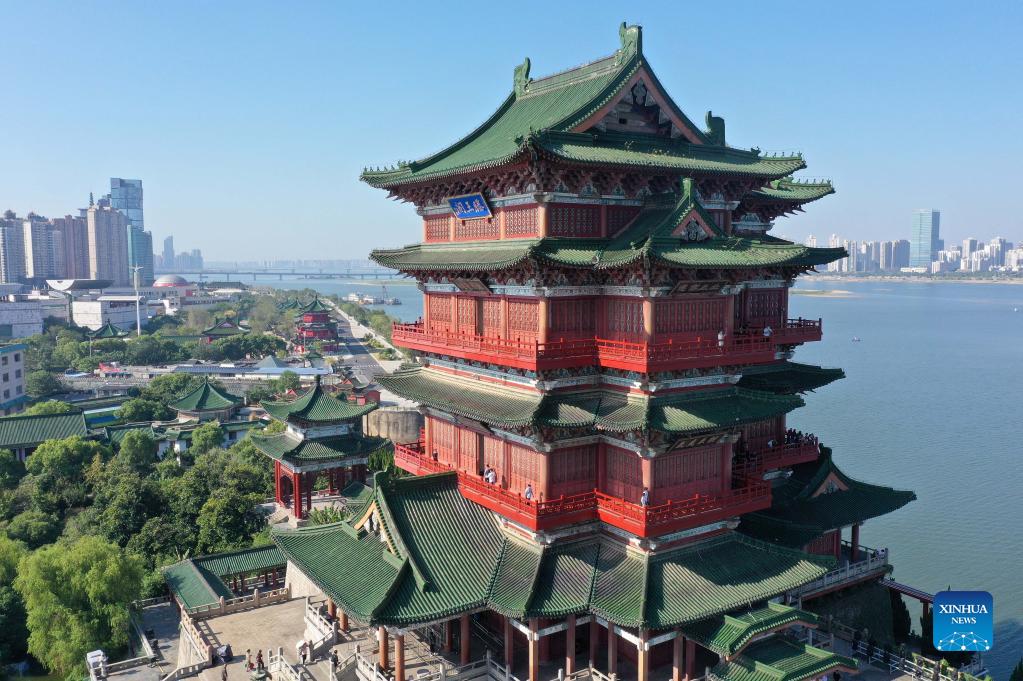 Aerial photo taken on Oct. 5, 2021 shows the Tengwang Pavilion scenic spot in Nanchang, capital of east China's Jiangxi Province. (Xinhua/Peng Zhaozhi)