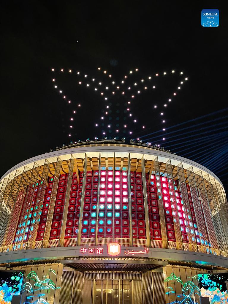 Photo taken on Oct. 4, 2021 shows the light show at the China Pavilion of Expo 2020 Dubai in Dubai, the United Arab Emirates. Covering an area of 4,636 square meters, the China Pavilion is one of the largest at the expo. Featuring a lantern-shaped design, the pavilion is called "The Light of China," symbolizing hope and a bright future. (Xinhua/Su Xiaopo)