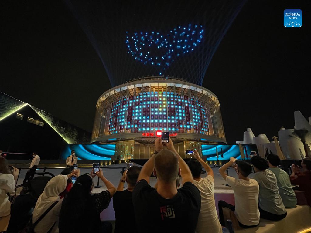 People take pictures of the light show at the China Pavilion of Expo 2020 Dubai in Dubai, the United Arab Emirates, Oct. 4, 2021. Covering an area of 4,636 square meters, the China Pavilion is one of the largest at the expo. Featuring a lantern-shaped design, the pavilion is called "The Light of China," symbolizing hope and a bright future. (Xinhua/Su Xiaopo)