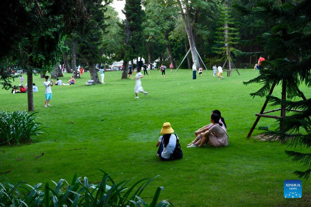People have fun at the Xiamen Botanical Garden in Xiamen, southeast China's Fujian Province, Oct. 5, 2021. Outdoor public places in Xiamen started to reopen from Oct. 5, as the results of the sixth round of citywide nucleic acid testing all came out negative. (Xinhua/Jiang Kehong)
