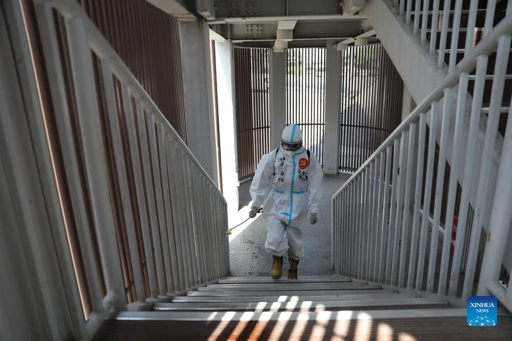 A fireman disinfects the entrance of a skywalk in Xiamen, southeast China's Fujian Province, Oct. 5, 2021. Outdoor public places in Xiamen started to reopen from Oct. 5, as the results of the sixth round of citywide nucleic acid testing all came out negative. (Photo by Zeng Demeng/Xinhua)