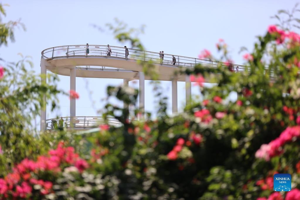 Photo taken on Oct. 5, 2021 shows people walking on a skywalk in Xiamen, southeast China's Fujian Province. Outdoor public places in Xiamen started to reopen from Oct. 5, as the results of the sixth round of citywide nucleic acid testing all came out negative. (Photo by Zeng Demeng/Xinhua)