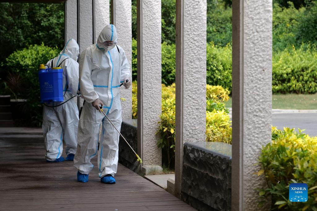 Firemen disinfect a wetland park in Xiamen, southeast China's Fujian Province, Oct. 5, 2021. Outdoor public places in Xiamen started to reopen from Oct. 5, as the results of the sixth round of citywide nucleic acid testing all came out negative. (Photo by Ye Yiheng/Xinhua)