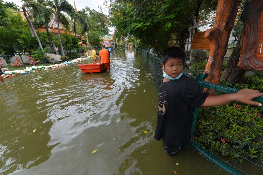 A boy stands on a flooded road on the outskirts of Bangkok, Thailand, on Sept. 3, 2021. (Xinhua/Rachen Sageamsak)