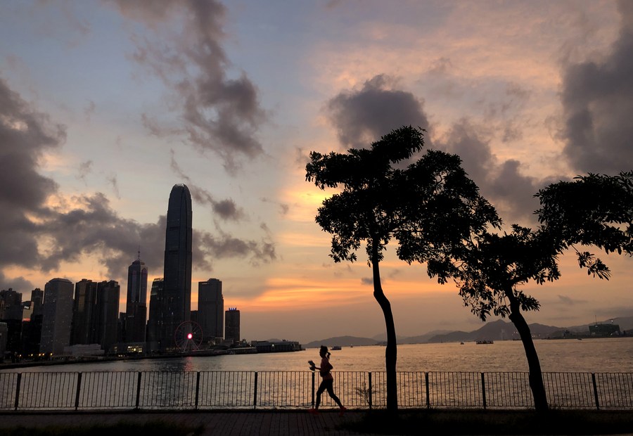 A citizen jogs on the shore of the Victoria Harbor in Hong Kong, south China, Aug. 24, 2020. (Xinhua/Li Gang)