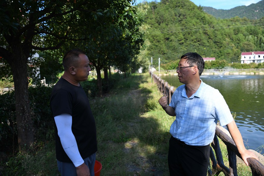 Li Xingguo (R), a senior geological engineer, talks with a villager in Henan Village of Wuhe Township, Yuexi County, in east China's Anhui Province, Sept. 14, 2021. (Xinhua/Zhang Duan)