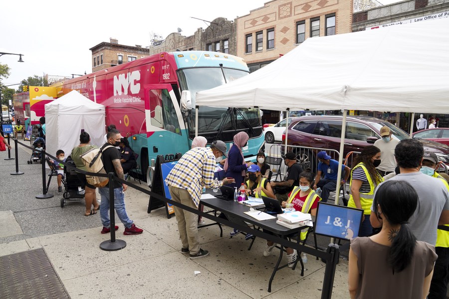 People wait outside a mobile vaccine clinic in New York, the United States, on Aug. 31, 2021. (Xinhua/Wang Ying)