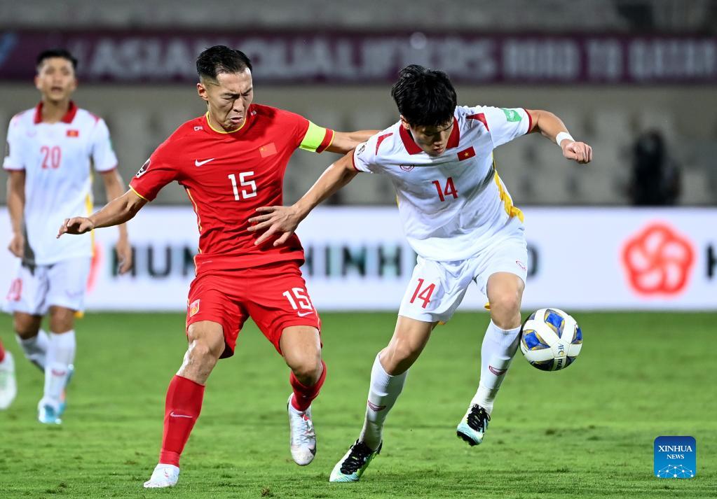 Wu Xi (C) of China competes with Nguyen Hoang Duc (R) of Vietnam during the FIFA World Cup Qatar 2022 Asian qualification football match between China and Vietnam in Sharjah, the United Arab Emirates, Oct. 7, 2021. (Xinhua)