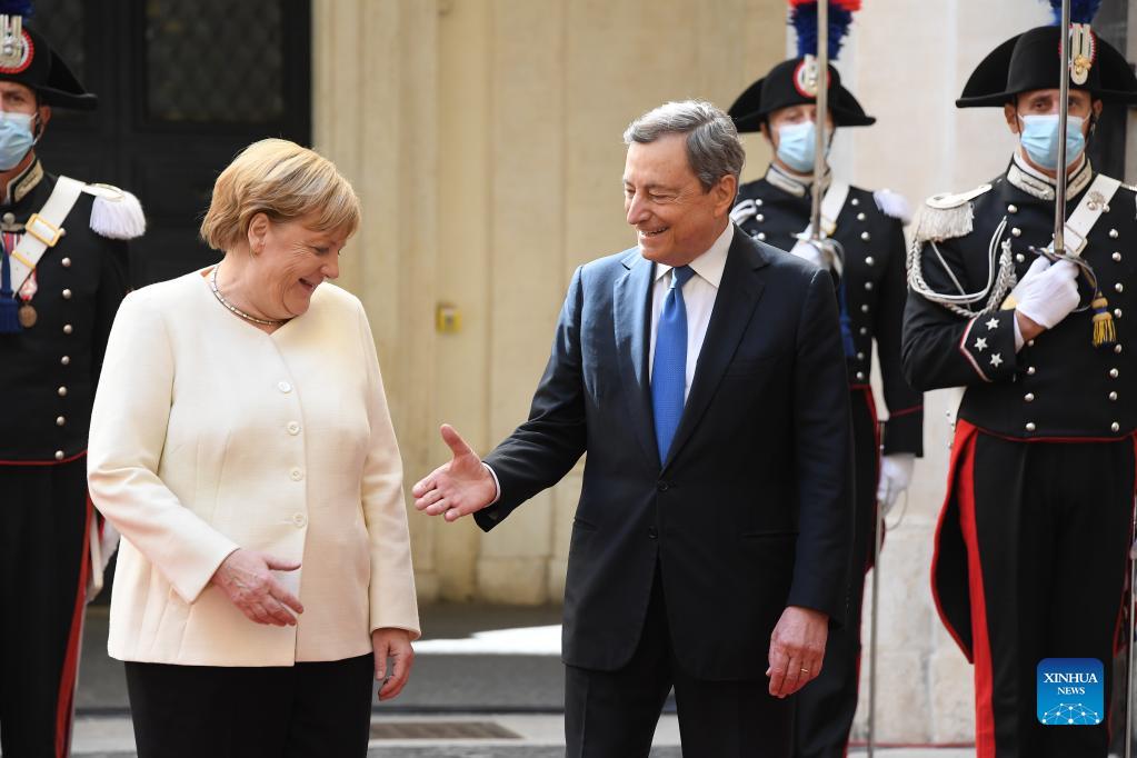 Italian Prime Minister Mario Draghi (R, Front) welcomes visiting German Chancellor Angela Merkel (L, Front) in Rome, Italy, on Oct. 7, 2021. Italian Prime Minister Mario Draghi on Thursday thanked outgoing German Chancellor Angela Merkel for playing a "decisive role" in shaping the future of the European Union (EU). (Str/Xinhua)