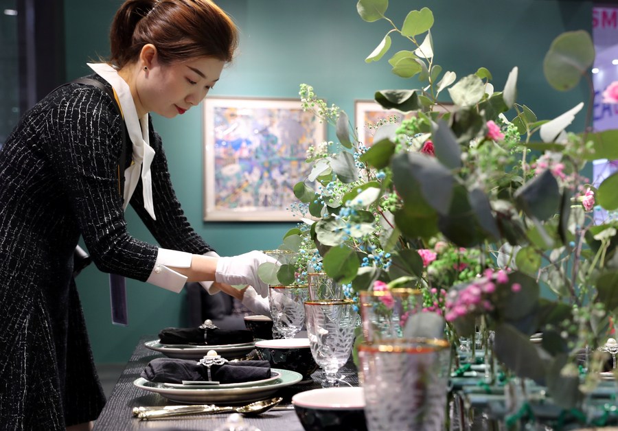 A staff member works at a booth for Danish household products at the Lifestyles exhibition area during the second China International Import Expo (CIIE) in Shanghai, east China, Nov. 5, 2019. (Xinhua/Liu Ying)