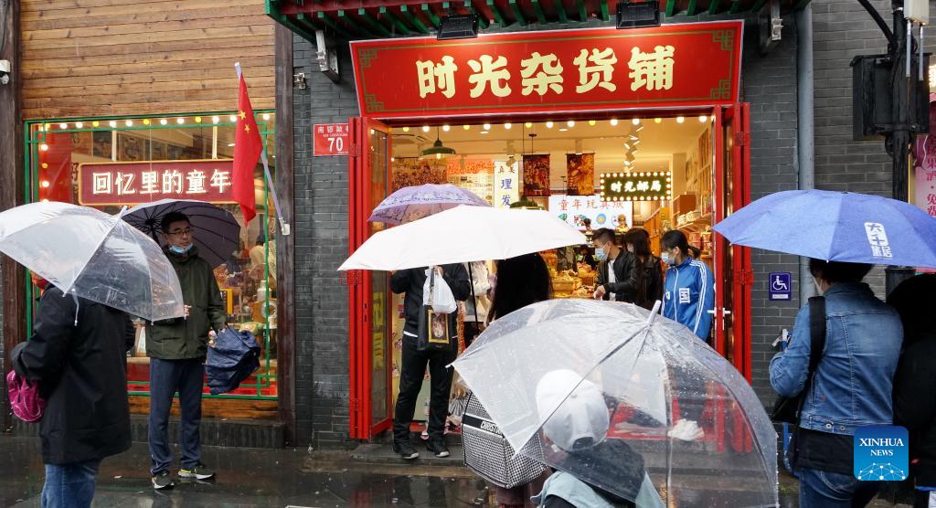 People walk past a shop at the Nanluoguxiang Lane during the week-long National Day holiday in Beijing, capital of China, Oct. 6, 2021. (Xinhua/Li Xin)