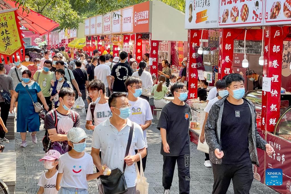 People visit a food street during the week-long National Day holiday in Wuhan, central China's Hubei Province, Oct. 2, 2021. (Xinhua/Xiao Yijiu)