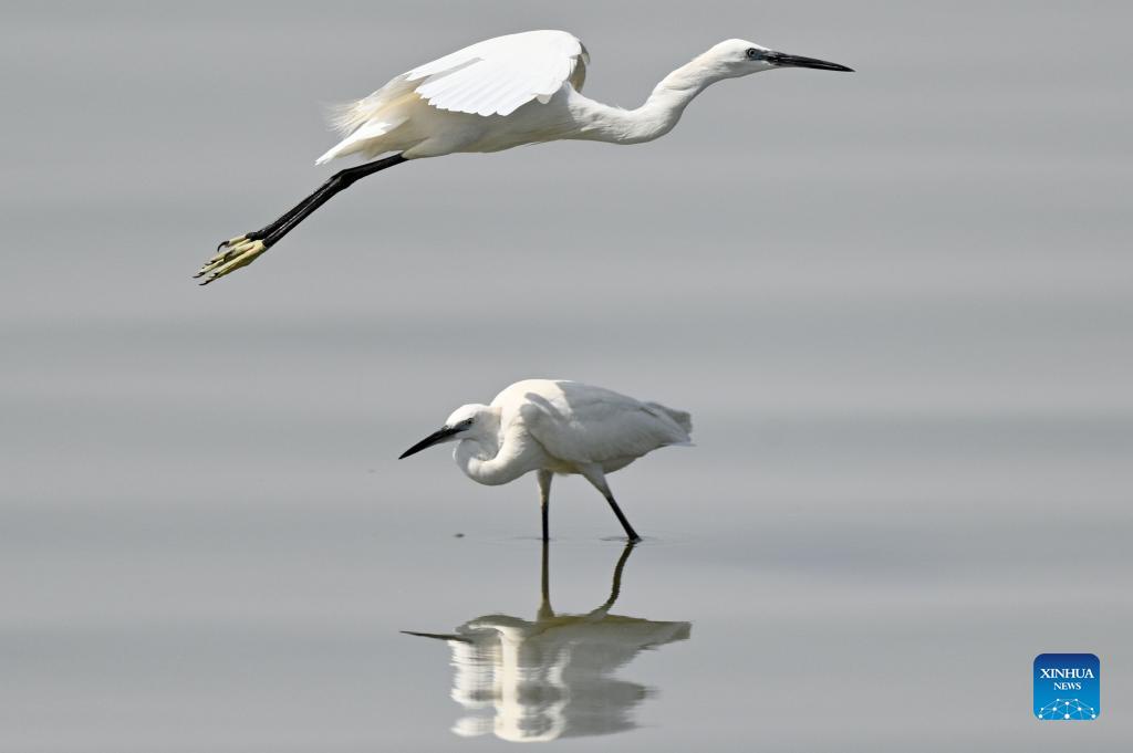 Egrets are seen at a beach in Capital Governorate, Kuwait, Oct. 6, 2021. (Photo by Ghazy Qaffaf/Xinhua)