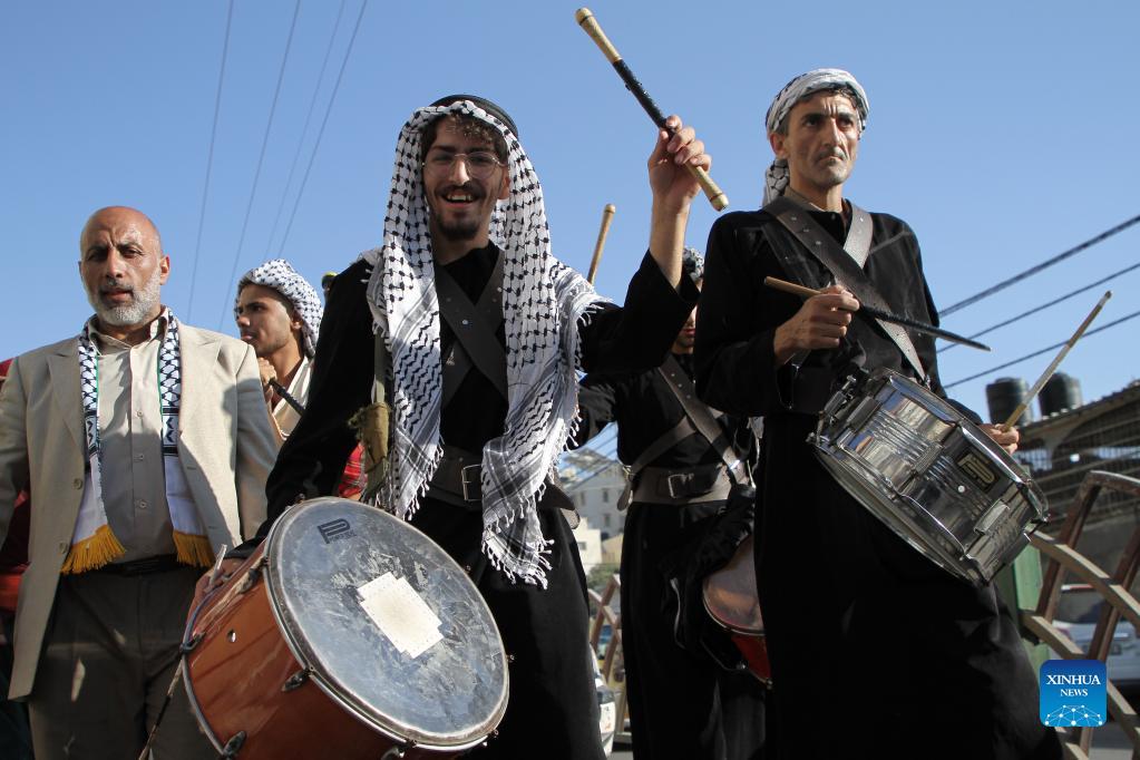 Palestinians participate in an event simulating a traditional Palestinian wedding in celebration of Palestinian Heritage Day in Gaza City, on Oct. 7, 2021. (Photo by Rizek Abdeljawad/Xinhua)