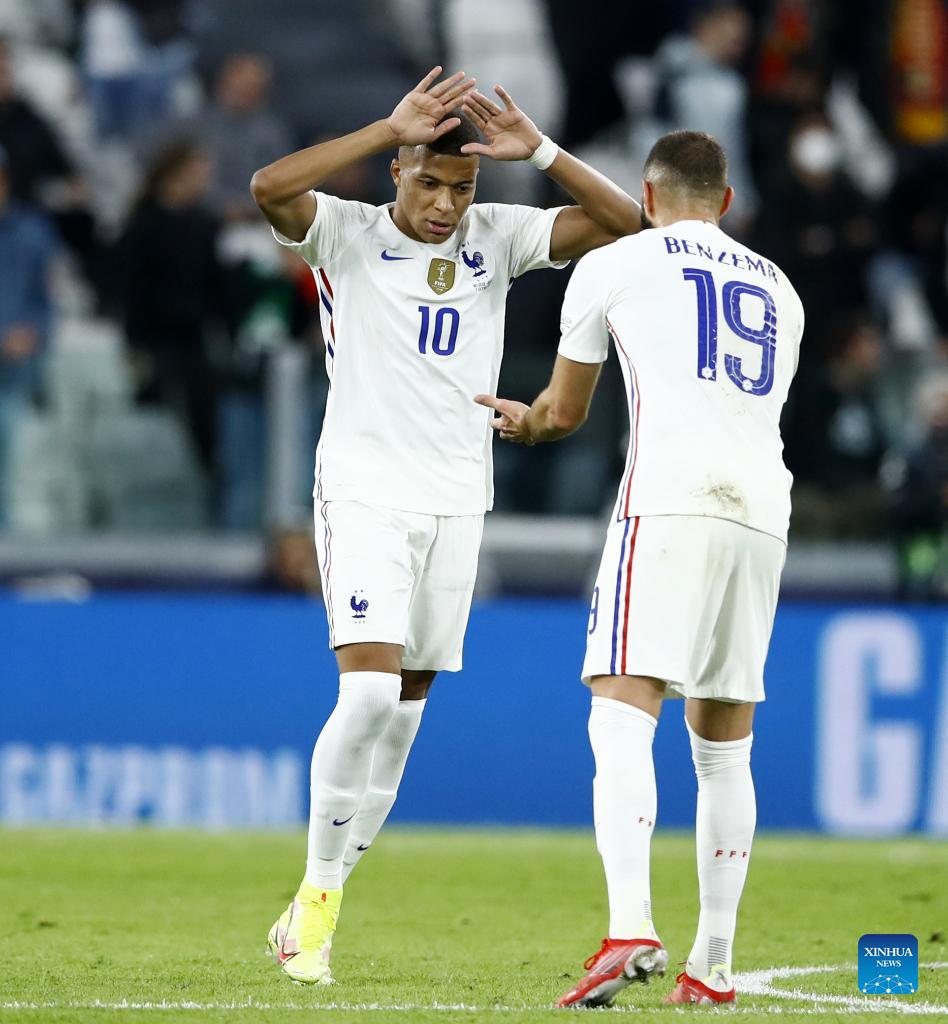 France's Kylian Mbappe (L) celebrates with teammate Karim Benzema during the UEFA Nations League semifinal between Belgium and France in Turin, Italy, Oct. 7, 2021. (Str/Xinhua)