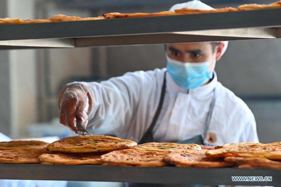 A worker arranges newly-made spicy Nang, a local flatbread, at a workshop of an industrial park in Horgos, northwest China's Xinjiang Uygur Autonomous Region, Feb. 5, 2021. (Xinhua/Ding Lei)