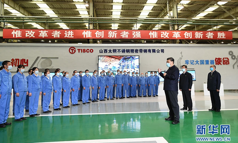 Xi Jinping talks with employees of the Fine Stainless Strip Steel Co., Ltd. of TISCO on May 12, 2020.