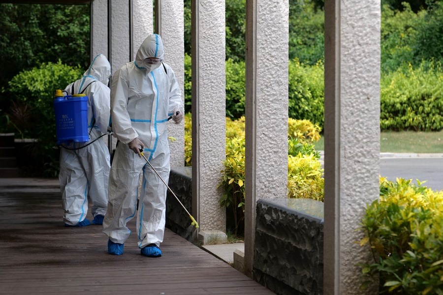 Firemen disinfect a wetland park in Xiamen, southeast China's Fujian Province, Oct. 5, 2021. Outdoor public places in Xiamen started to reopen from Oct. 5, as the results of the sixth round of citywide nucleic acid testing all came out negative. (Photo by Ye Yiheng/Xinhua)