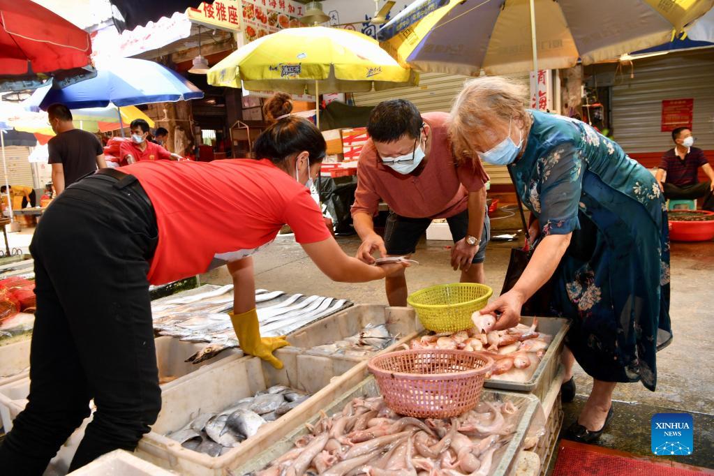 People buy aquatic products at a market in Xiamen City, southeast China's Fujian Province, Oct. 8, 2021. The city of Xiamen in southeast China's Fujian Province, which witnessed the country's latest resurgence of COVID-19 cluster infections, cleared all medium- and high-risk areas for COVID-19 on Thursday night. The city downgraded three medium-risk areas and one high-risk area for COVID-19 to low-risk areas starting 9 p.m. Thursday, according to the municipal epidemic prevention and control headquarters. (Xinhua/Jiang Kehong)