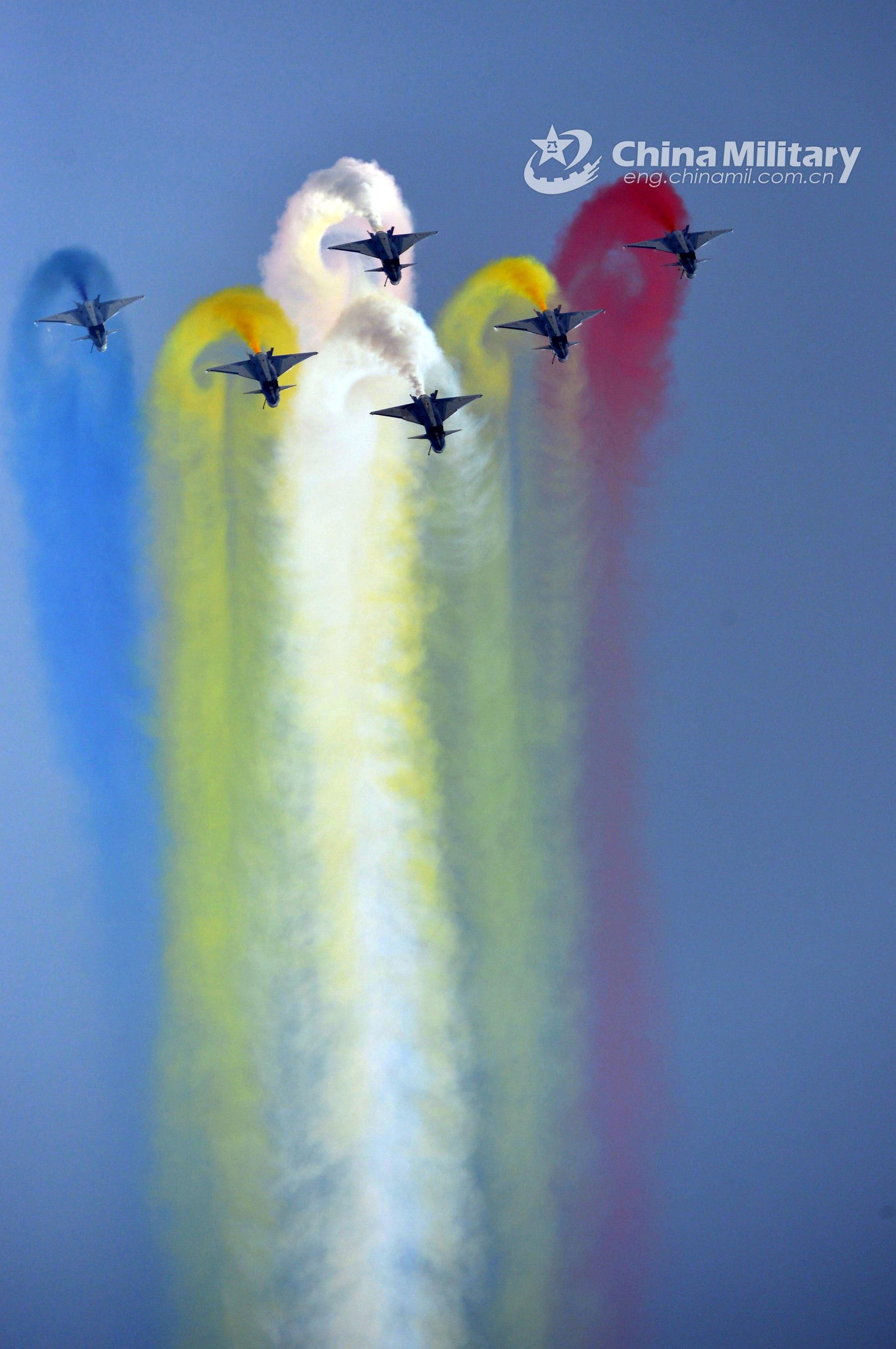 J-10 fighter jets attached to the PLA Air Force's Bayi Aerobatics Team perform aerobatic stunts during a six-day airshow in Zhuhai, South China's Guangdong Province, on Sept. 29, 2021. The 13th China International Aviation and Aerospace Exhibition, or Airshow China 2021, was held from September 28 to October 3, 2021. (eng.chinamil.com.cn/Photo by Yu Hongchun)