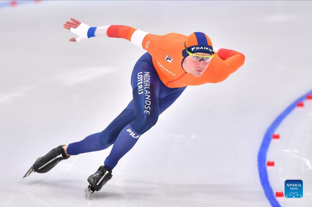 Kayo Vos of the Netherlands competes during the Experience Beijing Speed Skating China Open Men's 500m in Beijing, China on Oct. 8, 2021. (Xinhua/Chen Yichen)