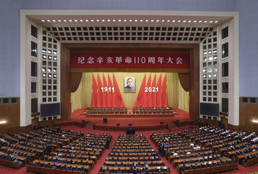 A commemorative meeting marking the 110th anniversary of the Revolution of 1911 is held at the Great Hall of the People in Beijing, capital of China, Oct. 9, 2021. (Xinhua/Liu Bin)