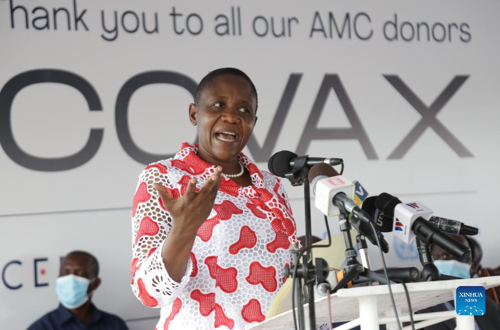 Tanzanian Minister for Health, Community Development, Gender, Elderly and Children Dorothy Gwajima speaks after receiving a batch of the Sinopharm vaccine from China, at Julius Nyerere International Airport in Dar es Salaam, Tanzania, on Oct. 8, 2021. Tanzania on Friday received 1,065,600 doses of the Sinopharm vaccine from China under COVAX, boosting the east African nation's vaccination campaign against COVID-19. COVAX is a global program aimed at providing equitable access to COVID-19 vaccines. (Photo by Herman Emmanuel/Xinhua)