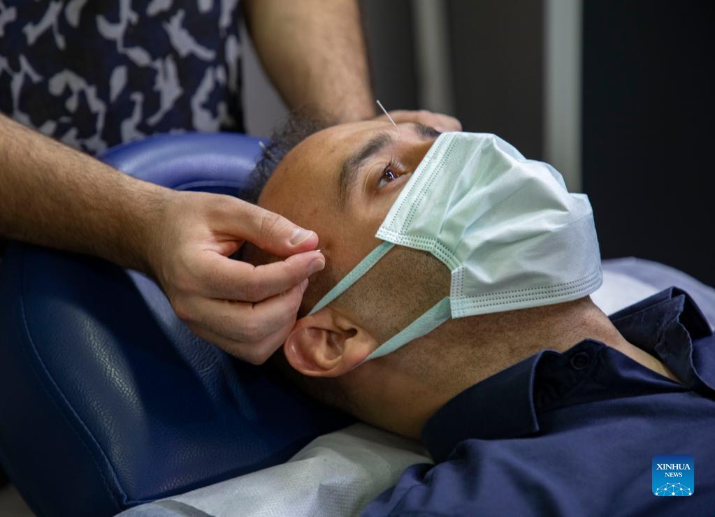 A man receives acupuncture treatment in Istanbul, Turkey, Sept. 28, 2021. (Photo by Osman Orsal/Xinhua)