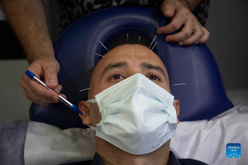 A man receives acupuncture treatment in Istanbul, Turkey, Sept. 28, 2021. (Photo by Osman Orsal/Xinhua)