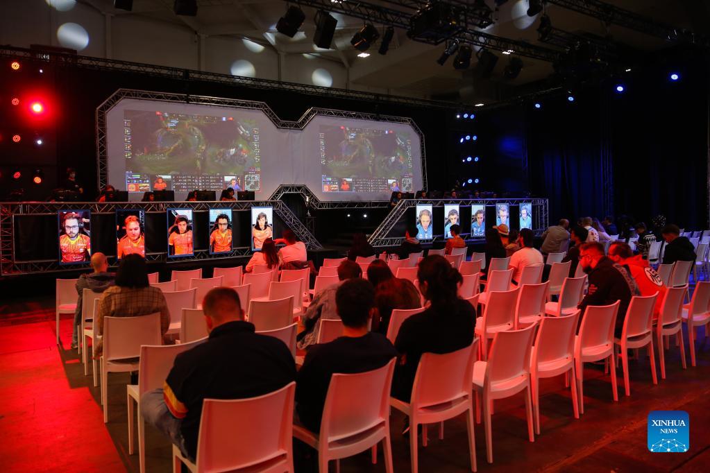 Visitors watch an E-sport game at the Made in Asia animation and cartoon products fair in Brussels, Belgium, Oct. 8, 2021. (Xinhua/Zheng Huansong)