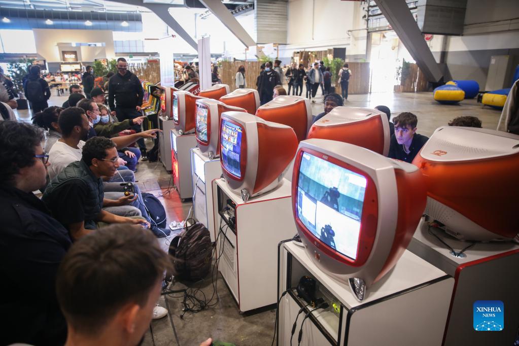 Visitors play video games at the Made in Asia animation and cartoon products fair in Brussels, Belgium, Oct. 8, 2021. (Xinhua/Zheng Huansong)