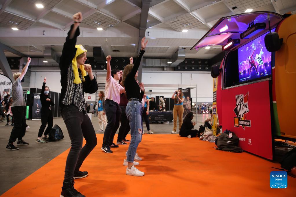 Visitors play video game at the Made in Asia animation and cartoon products fair in Brussels, Belgium, Oct. 8, 2021. (Xinhua/Zheng Huansong)