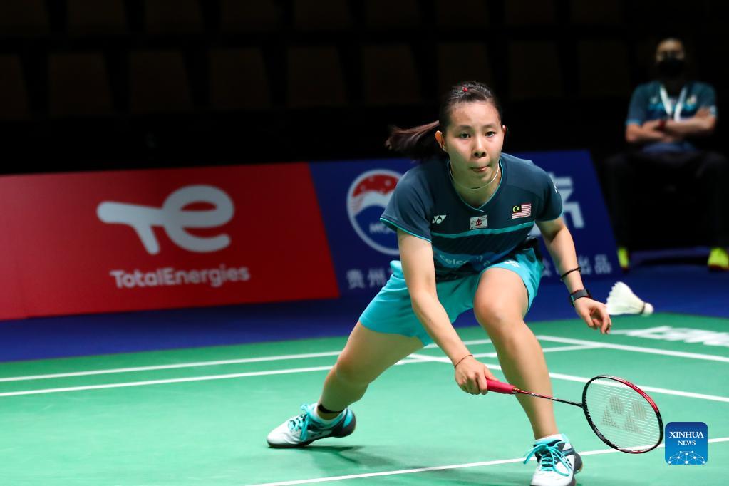 Malaysia's Eoon Qi Xuan competes in the women's singles match against China's Chen Yufei during the group D match between China and Malaysia at Uber Cup badminton tournament in Aarhus, Denmark, Oct. 10, 2021. (Xinhua/Zhang Cheng)