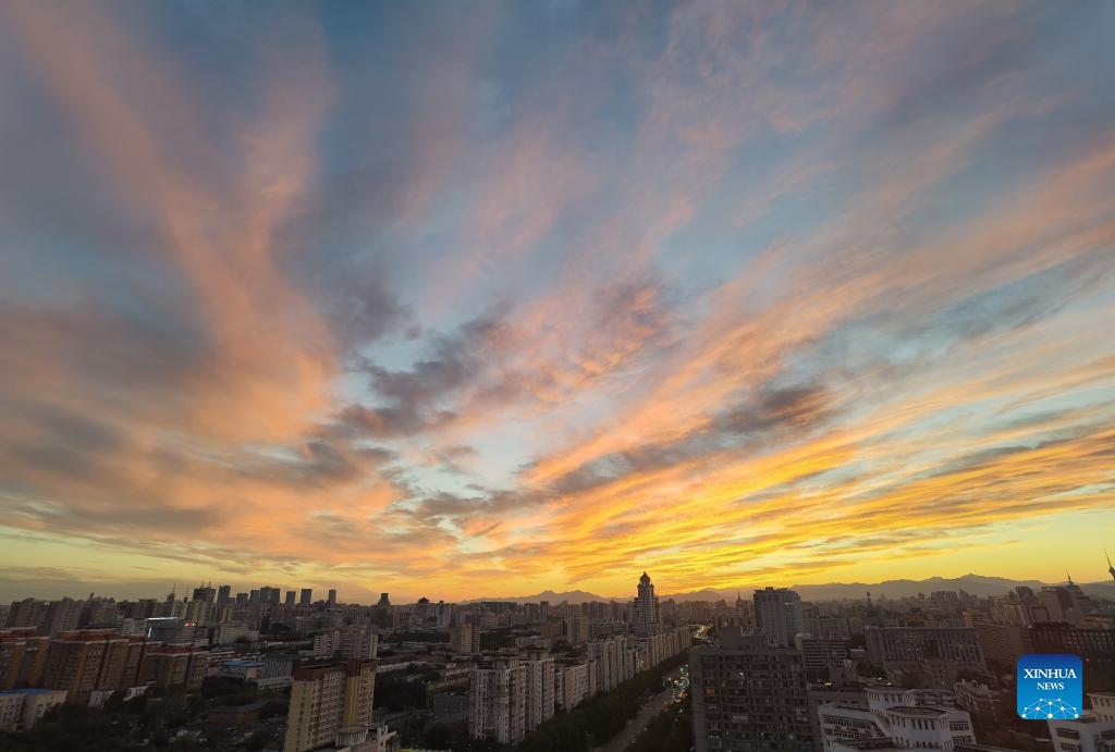 Photo taken on Oct. 10, 2021 shows the view of sunset glow in Beijing, capital of China. (Xinhua/Luo Xiaoguang)
