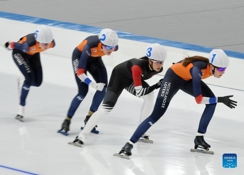 Yang Binyu (2nd R) of China and Leonie Bats (1st R), Isabel Grevelt (2nd L), Sophie Kraaijeveld of the Netherlands compete during the women's mass start competition at the Experience Beijing Speed Skating China Open in Beijing, capital of China, on Oct. 10, 2021. (Xinhua/Zhang Chenlin)