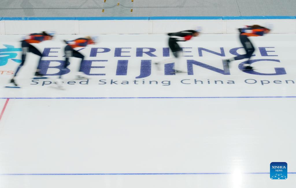 Athletes compete during the women's mass start competition at the Experience Beijing Speed Skating China Open in Beijing, capital of China, on Oct. 10, 2021. (Xinhua/Zhang Chenlin)