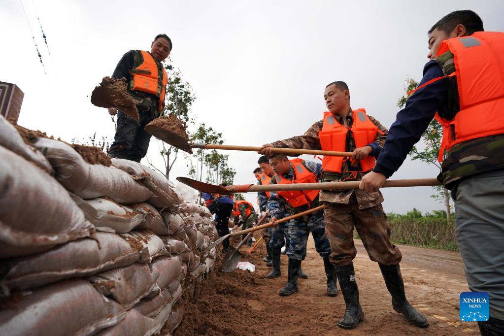 Rescuers fortify temporary dyke against the flood at Lianbo Village in Hejin City, north China's Shanxi Province, Oct. 10, 2021. More than 120,000 people have been temporarily evacuated after continuous downpours triggered floods in north China's Shanxi Province, authorities said Sunday. The floods have disrupted the lives of 1.76 million residents from 76 counties, cities and districts, according to the provincial department of emergency management. Some 190,000 hectares of crops were damaged and more than 17,000 houses collapsed, the department said. Emergency management departments of various levels have allocated 4,000 tents, 3,200 folding beds as well as cotton clothes and quilts for disaster relief. (Xinhua/Zhan Yan)