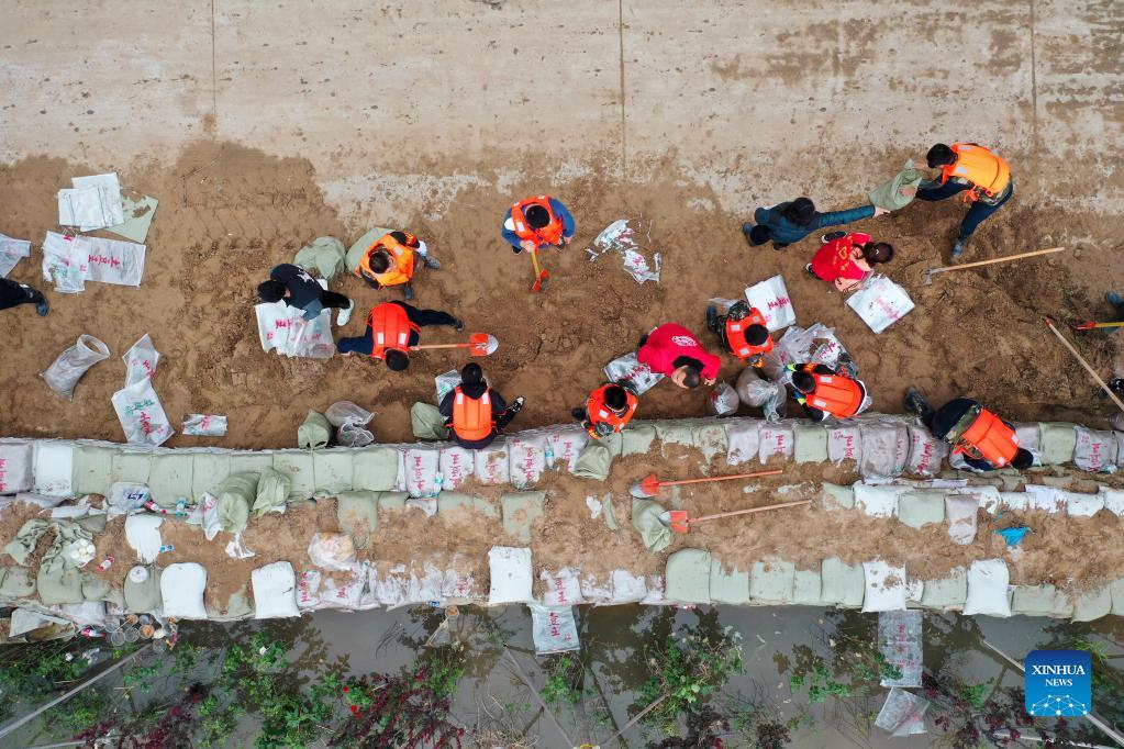 Aerial photo shows rescuers fortifying temporary dyke against the flood at Lianbo Village in Hejin City, north China's Shanxi Province, Oct. 10, 2021. More than 120,000 people have been temporarily evacuated after continuous downpours triggered floods in north China's Shanxi Province, authorities said Sunday. The floods have disrupted the lives of 1.76 million residents from 76 counties, cities and districts, according to the provincial department of emergency management. Some 190,000 hectares of crops were damaged and more than 17,000 houses collapsed, the department said. Emergency management departments of various levels have allocated 4,000 tents, 3,200 folding beds as well as cotton clothes and quilts for disaster relief. (Xinhua/Zhan Yan)