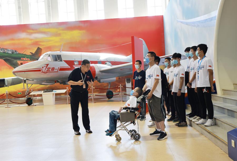 Xing Yifan in a wheelchair, together with his classmates, visits an aerospace museum at Beihang University in Beijing, on Sept. 7, 2021. (Di Bailu/Handout via Xinhua)