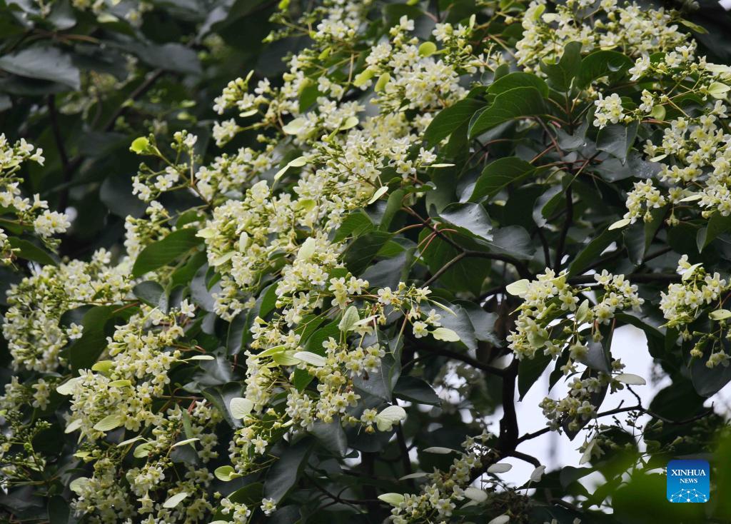 Photo taken on July 8, 2021 shows blossoms of an emmenopterys henryi tree in the Longquanshan city forest park in Chengdu, southwest China's Sichuan Province. A total of 35 emmenopterys henryi trees have been found in the city forest park. The plant is under China's second-class protection. (Photo by Wu Xiaogang/Xinhua)