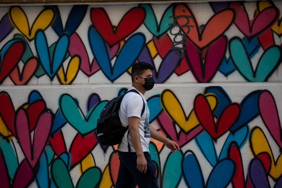 A man wearing a face mask passes a mural of heart-shaped patterns in the Brooklyn borough of New York, the United States, Oct. 2, 2021.(Photo by Michael Nagle/Xinhua)