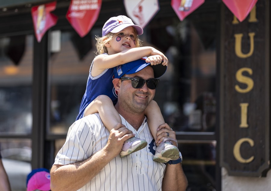 A man carrying a girl on shoulders goes to a Chicago Cubs' game in Chicago, the United States, on June 11, 2021. (Photo by Joel Lerner/Xinhua)