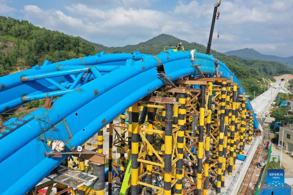 Aerial photo shows constructors working at the construction site of Beizitou grand bridge in Huidong County of Huizhou, south China's Guangdong Province, Oct. 11, 2021. As part of the Guangzhou-Shanwei High Speed Railway, the 112-meter bridge finished its tied-arch closure on Monday. (Xinhua/Liu Dawei)