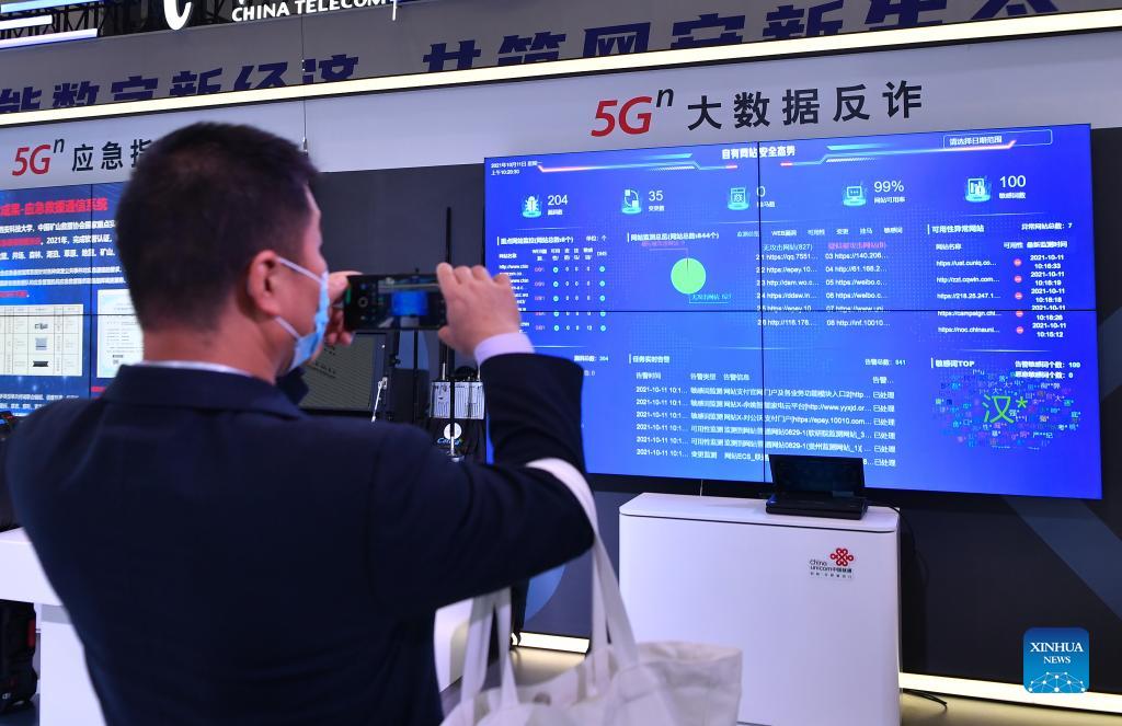 A visitor takes photo at the cybersecurity expo of 2021 China Cybersecurity Week in Xi'an, capital of northwest China's Shaanxi Province, Oct. 11, 2021. This year's edition of China's annual cybersecurity publicity week runs from Oct. 11 to 17 nationwide. (Xinhua/Zhang Bowen)