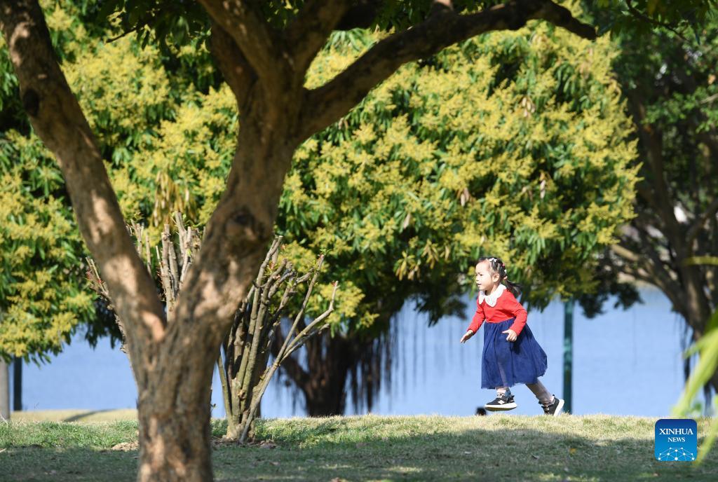 A gril runs near Nanhu lake in Nanning, south China's Guangxi Zhuang Autonomous Region, Feb. 17, 2021. (Xinhua/Lu Boan)